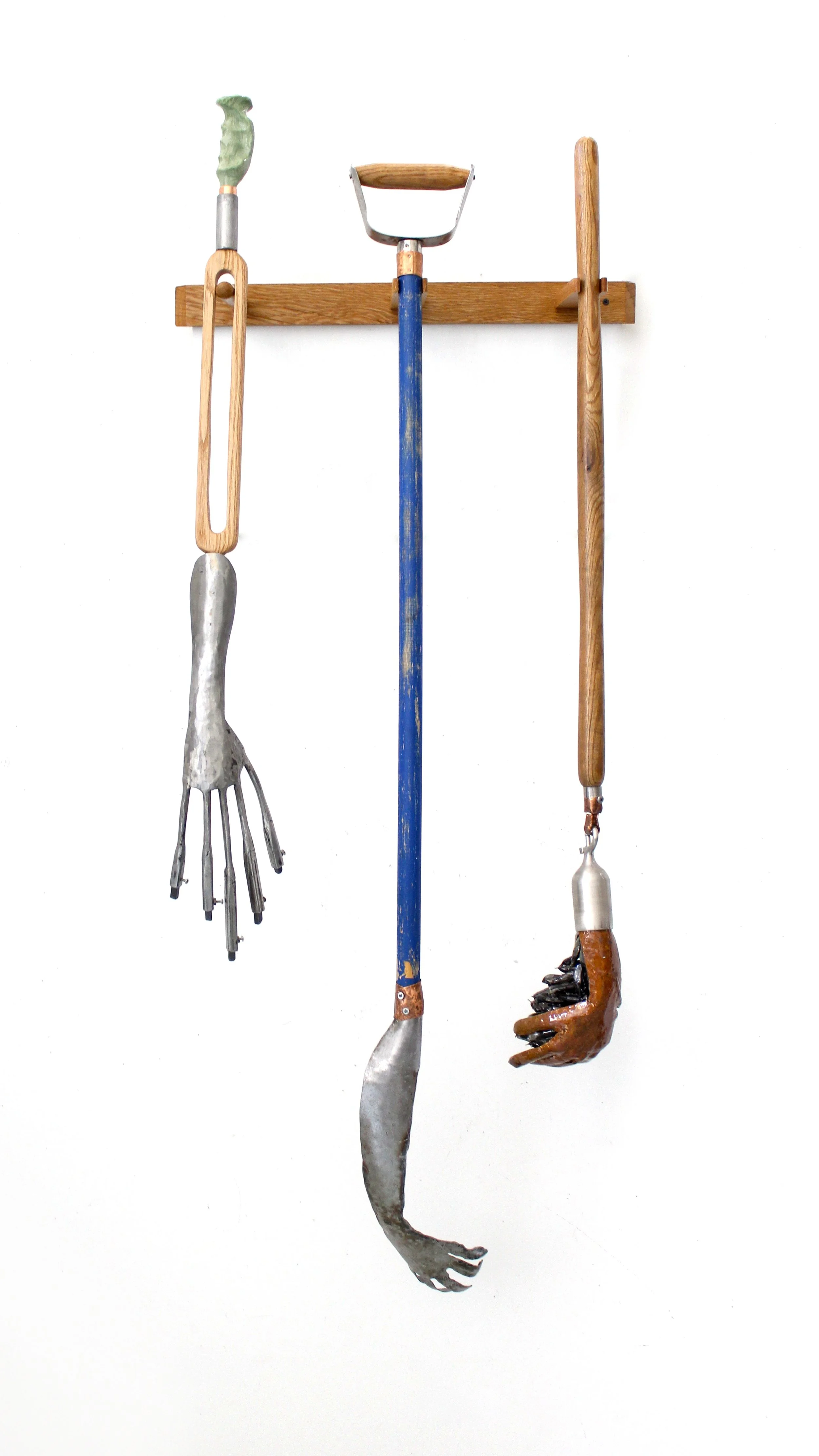 The sculptures are built from materials sourced from hardware stores and industrial supply shops: wood, metal, resin, epoxy, sometimes incorporating collected and altered found objects. Each piece bears the physical markers of functionality, brush bristles, handles, and grips, yet their intended use remains ambiguous. In this way, the artist doesn’t use instruments to make art, but rather, Fischer opts to make the instruments art, constructing objects that occupy the space between sculpture and implement, between aesthetic object and functional device.
